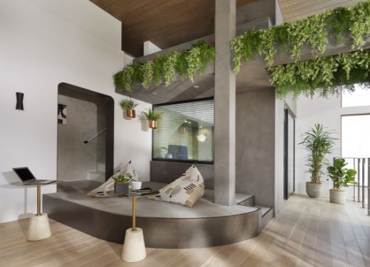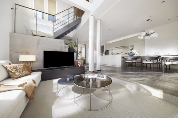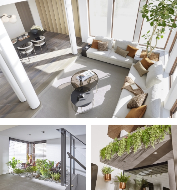 段差を設けることで緩やかに仕切られ、開放的な吹抜でありつつ、くつろげる空間。