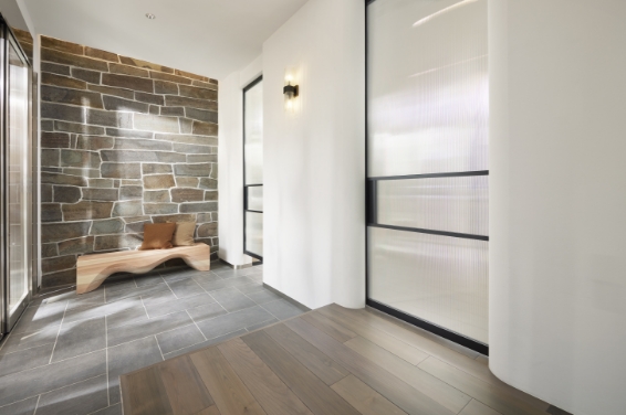 石貼りの壁が上質な雰囲気を演出。靴の着脱に便利なベンチつき。