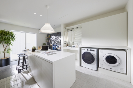 洗濯から乾燥、アイロン、収納までワンストップで行える空間。室内物干しも完備。