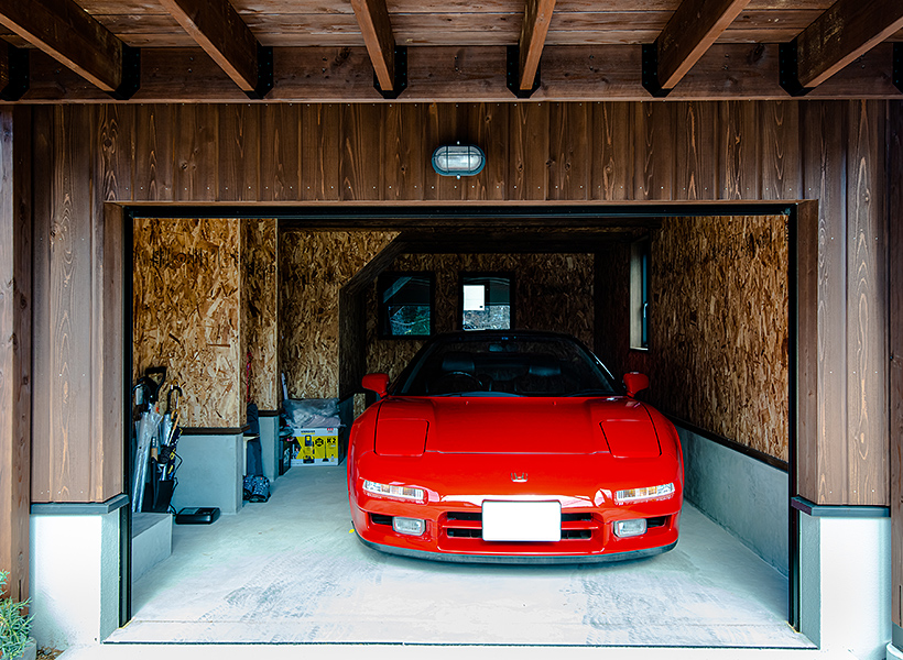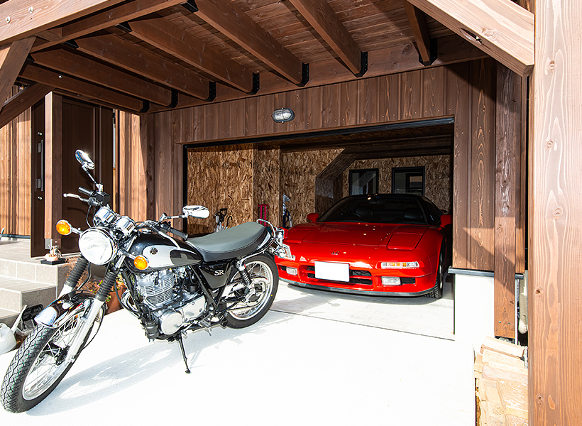 BinOのアウトドアストッカーをアレンジした、ビルトンガレージ。お車の入出庫の際にハンドルを切らずにスムーズに出入りできるよう、ガレージ開口部にあった耐力壁を調整して開口を広げています。