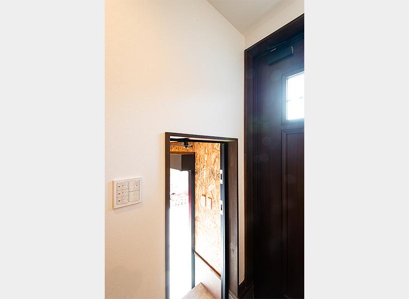 玄関には、ビルトインガレージと行き来のできるドアを設けています。ビルトインガレージに入ってすぐの右手に、照明と電動シャッターのスイッチを設置しています。