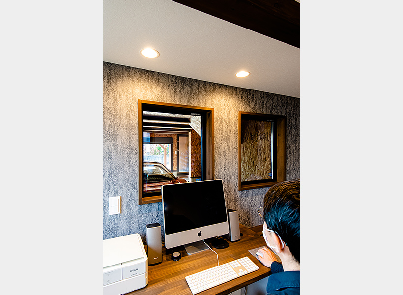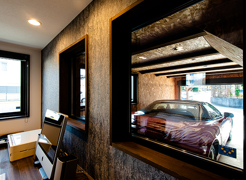 書斎には、ビルトインガレージのお車を眺めることのできる窓をふたつ設けました。「窓をふたつにすることは細田工務店からの提案でした。書斎のどこからでも車を見ることができる、ありがたい提案でした」とご主人。