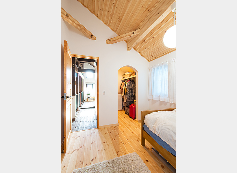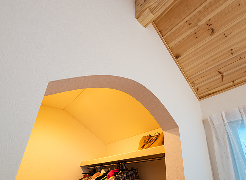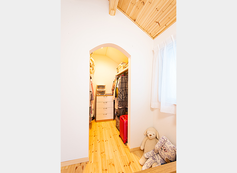 ウォークインクロゼットは扉を設けず、アーチ状の開口にしました。「細田工務店からの提案でしたが、部屋を広く感じることができ、とても良かったと思います。布団もしまうことができる収納力にも満足しています」とご主人。