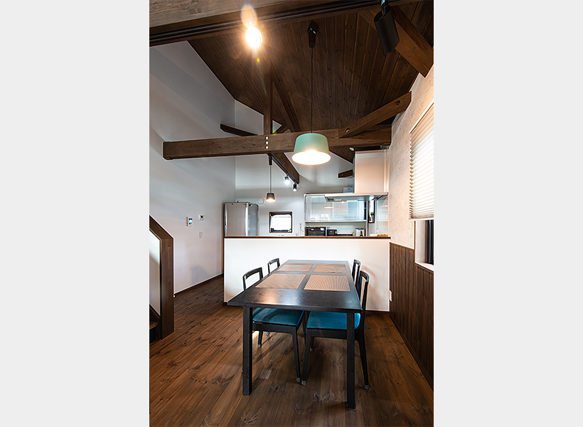 高い位置に設けられた南側の窓からは、ダイニングとキッチンにも光が届きます。「天然木の柱や梁を見せた室内に、どういう照明を選んだらいいかわかりませんでしたが、この室内に合うものを細田工務店が提案してくれました」と奥さま。