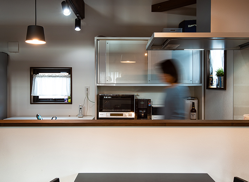お住まいの北側には隣地との間に5mほどの距離があることで、北側に設けた窓からも光が入り、明るい印象のキッチンになりました。「窓の前に置いたカウンターテーブルでお茶を飲んだりする予定でしたが、カウンターテーブルは犬のごはんなどを置くワンワンスペースになりました」と奥さま。