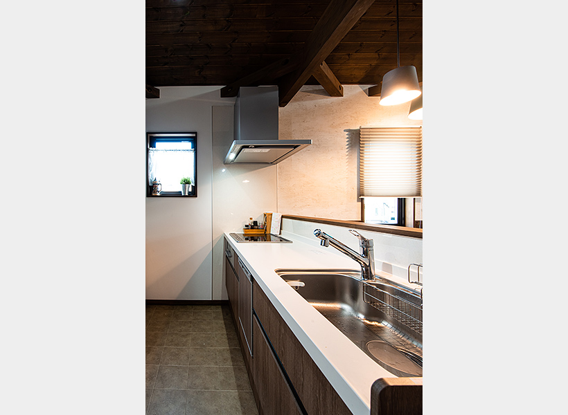 「マンションで使っていたキッチンよりも10cmほど小さいサイズになりましたが、今まで収納していたものはほとんど収納できました。スライド式の収納は奥まで十分に使うことができるので、収納力がありますね。IHクッキングヒーターは火力も十分ですし、コンロの周辺に物を置くこともできて使い勝手がとてもよいです。換気扇はお掃除しやすい機種を選びました」と奥さま。床のタイル貼りも、奥さまのご希望です。