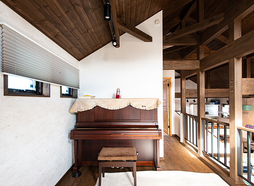 傾斜のある天井に張られたパインの無垢材と、同じく無垢の火打梁が印象的な娘さんのお部屋。「LDK同様に、棟の下にあたる部分は天井が高くなっているので、室内が広く感じますね」とご主人。