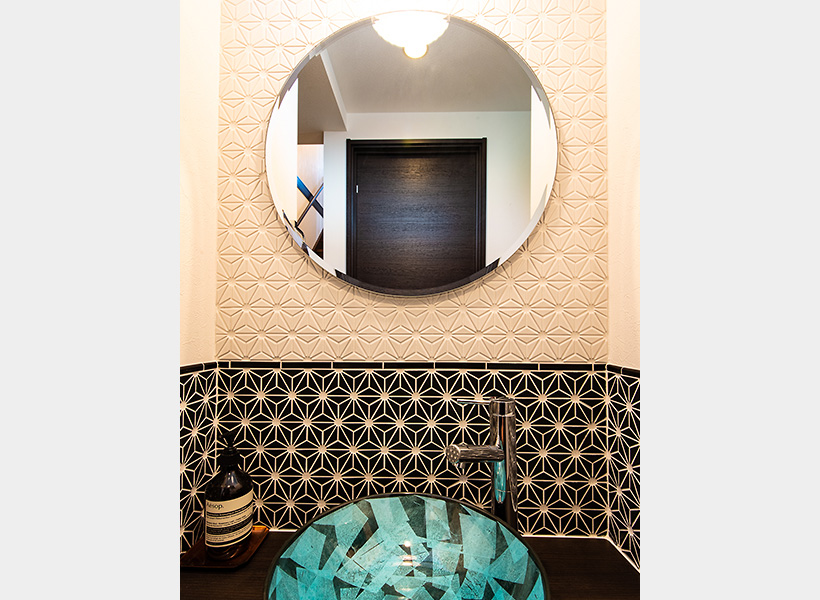 切り物が出ないよう、割り付けにこだわって仕上げたモザイクタイルの壁面は、ご主人がデザインされました。