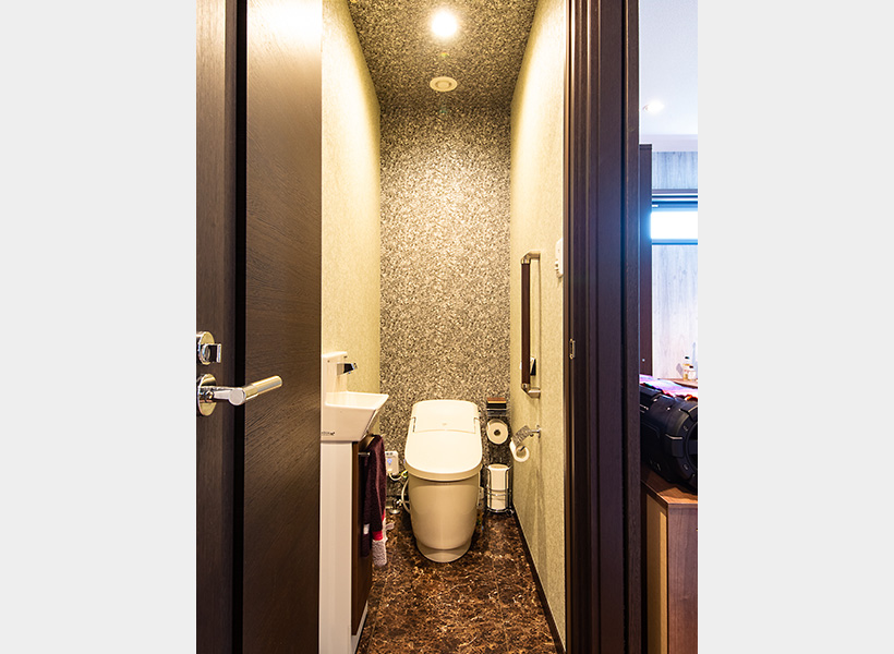 「小さな空間なので、ホワイト系でまとめるのではなく遊んでみたかった」とおっしゃるご主人が選ばれた、シックで落ち着いた印象の浴室。洗面室について、「洗面台の収納力が高くすっきり片付きます」と奥さま。