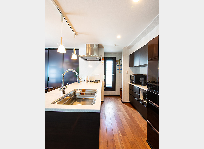 「私の背が高いので、キッチンのカウンターを高くしてもらいました。サービスバルコニーの前に設けたパントリーは小さなスペースですがとても便利なんですよ」と奥さま。