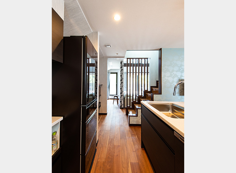 キッチンからベランダまでの動線上には階段と、リビングに隣接した家事スペースがあります。ベランダからの光を取り込む木の格子が印象的な階段は「料理中に腰かけてひと休みしたり、ふたりで会話を楽しんだりしています。意外な使い道でした」と奥さま。