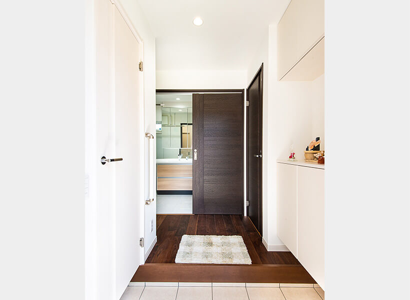 ドア窓から光が差し込む明るい玄関。一階は玄関からご主人お気に入りの無垢ウォールナットの床材を使用しています。柔らかい質感で歩いていて心地よいと喜んでいただけました。