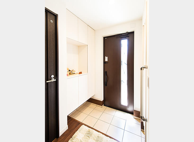 ドア窓から光が差し込む明るい玄関。一階は玄関からご主人お気に入りの無垢ウォールナットの床材を使用しています。柔らかい質感で歩いていて心地よいと喜んでいただけました。