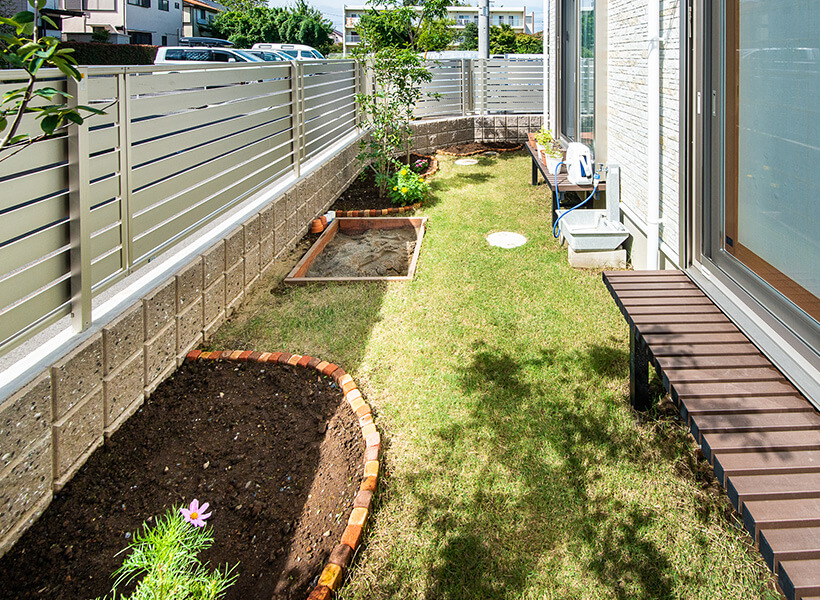 ご主人お気に入りのお庭。ご自身で花壇のレンガを並べ芝生も植えたそうです。夏にはご家族でトマトやキュウリも育てたのだとか。さらに、中央の砂場もご主人の自作です。奥さまのご実家にも砂場があり子どもの頃よく遊んでいたそうです。ご自身でつくることを楽しむご主人とご家族の笑顔が浮かぶお庭になりました。