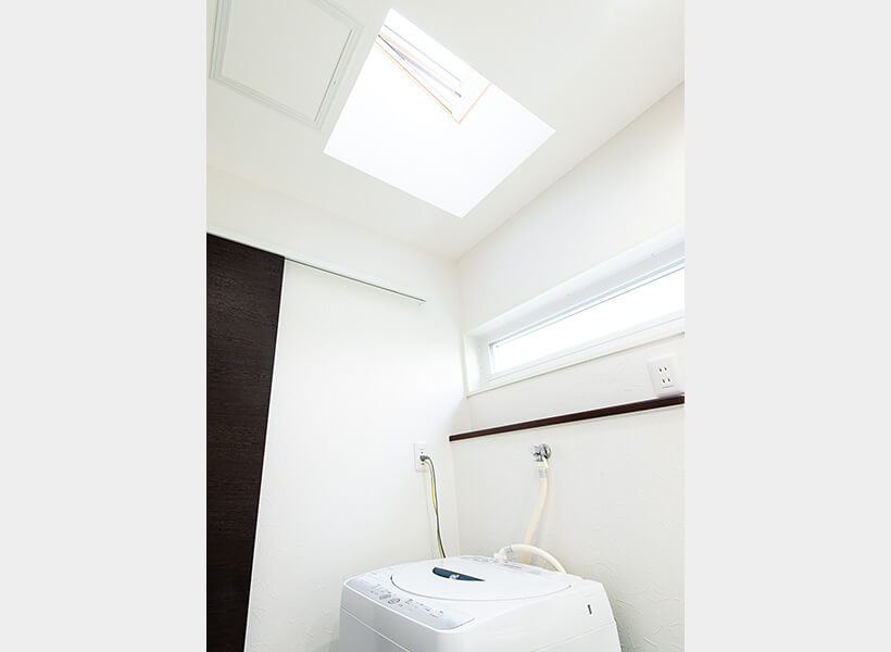 天窓のある広く明るい洗面室。メーカーにセミオーダーした洗面台は、家族みんなが並んで支度できるほどのゆったりサイズ。動線の効率を考えられた間取りは、忙しい朝や育児をサポートしてくれます。