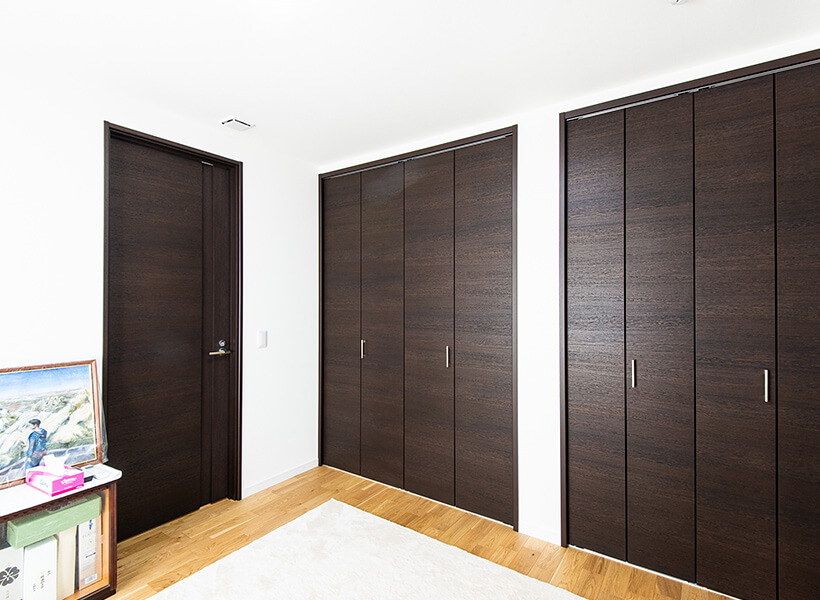 シックな色合いのご夫婦の寝室。現在は、おふたりの書斎やおもちゃの修理工房として利用されているのだとか。豊富な収納スペースを完備していて機能的です。