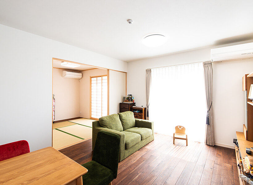 リビングはご主人担当。明るく風通しがよい家族団らんの空間です。窓の奥にはお庭が広がり、リビングと和室の両方からアクセスできます。青い子供用棚と赤と緑のチェアの色がご家族の楽しさを表しているようです。