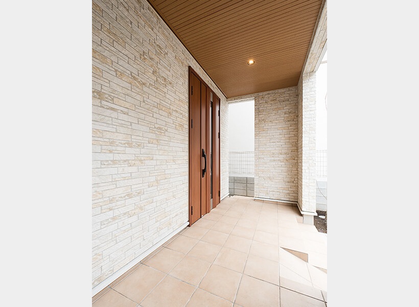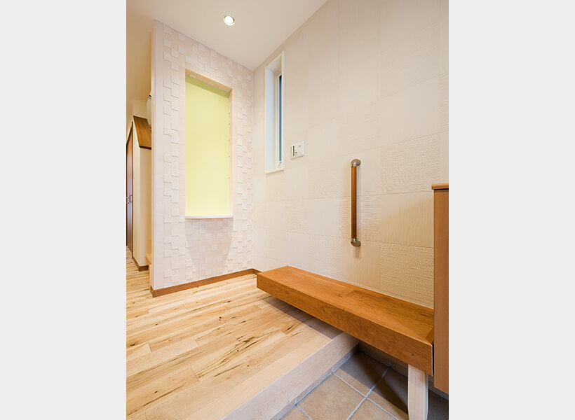 玄関、廊下は大勢のお客様をお招きすることを考え、十分なスペースを確保しました。玄関ドアは、必要に応じて大きく開口できる親子ドアです。「お客様をお招きした日は、25人分の靴を置くことができました」と奥さま。壁の2面をエコカラットで仕上げています。
