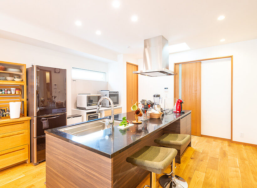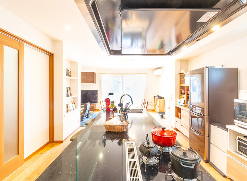 将来、お料理教室を開きたいとお考えの奥さまのために、キッチンは3~4人でも作業ができるスペースと動線を確保しています。「浜田山モデルハウスでこのキッチンを見て、ひと目で気に入りました」と奥さま。