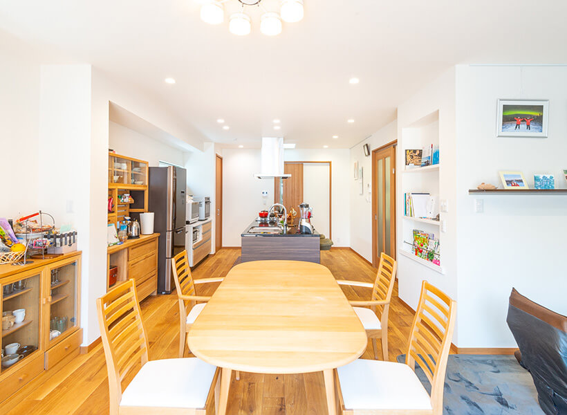 細田工務店をお選びいただいた理由について、奥さまは「こちらがお伝えしたことから私たちの意向を汲んでくださり、その上で私たちの半歩先を上手に提案して頂いたことですね。好感を持ちました」とのこと。また、ご主人は「経年によって劣化していくものではなく、経年によって味わいを増し、質が上がっていくものに目を向けて選択していくという僕たちの価値観と、細田工務店さんが大切にしている価値観に、共通項が多かったと思っています。例えばこの家は、木の経年変化を楽しもうと家の色々な場所に様々な種類の無垢材を使っているのですが、細田工務店さんが木を一生懸命大切にされていることに共感を覚えました。また、エコサーマルによる断熱性の高さも決め手になりました。冬場、就寝前にLDKの暖房を消しますが、朝になってもまだ暖かいんですよ」ということでした。