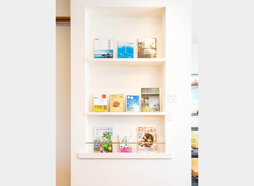 壁を利用して、アクセントになる飾り棚を作りました。菜園やお料理に関する本が、手に取りやすく並べてあります。