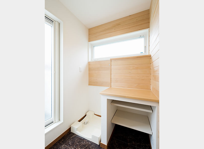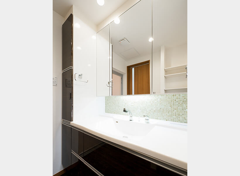 背の高いご主人が「少しでも広く、明るくしたかった」とおっしゃる洗面脱衣室は、浴室から家事コーナーを一直線で結んでいます。奥に家事コーナーが繋がっています。