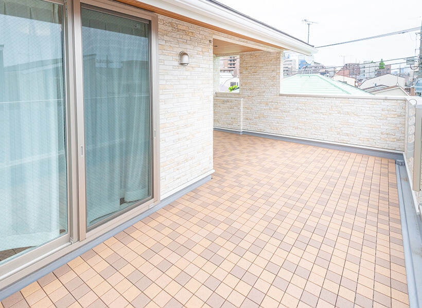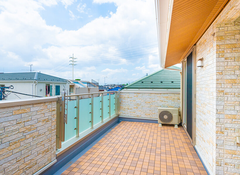広々とした開放感のあるバルコニーには、コンセントと水栓金具、タープ用のフックを設置しています。ご友人がいらっしゃった際には、タープを張って日陰を広げ、コーヒーと会話を楽しまれたそうです。